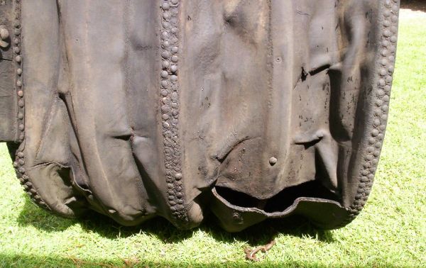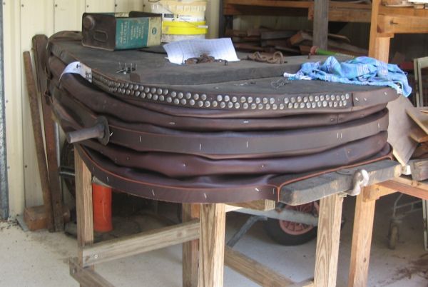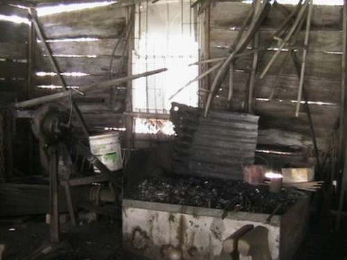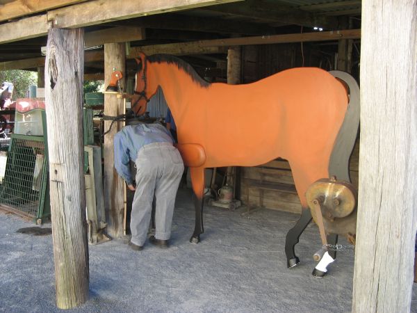 The Blacksmith was once the mainstay of any village or town in previous centuries. He created and repaired all types of metal objects in his forge. He also was the person who made and fitted shoes to horses and oxen, in fact he really was a “Jack of all trades”. Weapons and farm machinery were his specialties. The craft of blacksmithing is being kept alive at places like ours where volunteers practice the art. School groups in particular are fascinated by the fire, the red hot iron, the hammering and seeing the sparks fly. The double acting “Smiths Pattern” bellows in the pictures were restored by us and took two full cowhides to complete. These bellows date back to the late 1800’s and were made by Alldays & Onions of Birmingham, England. The blacksmith display area is next to the Coopers display and the Corn Shelling display.