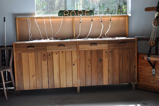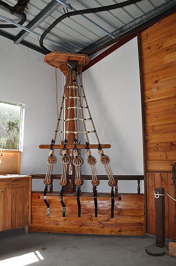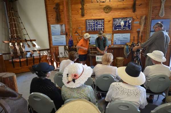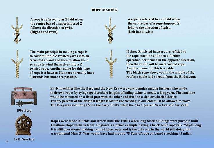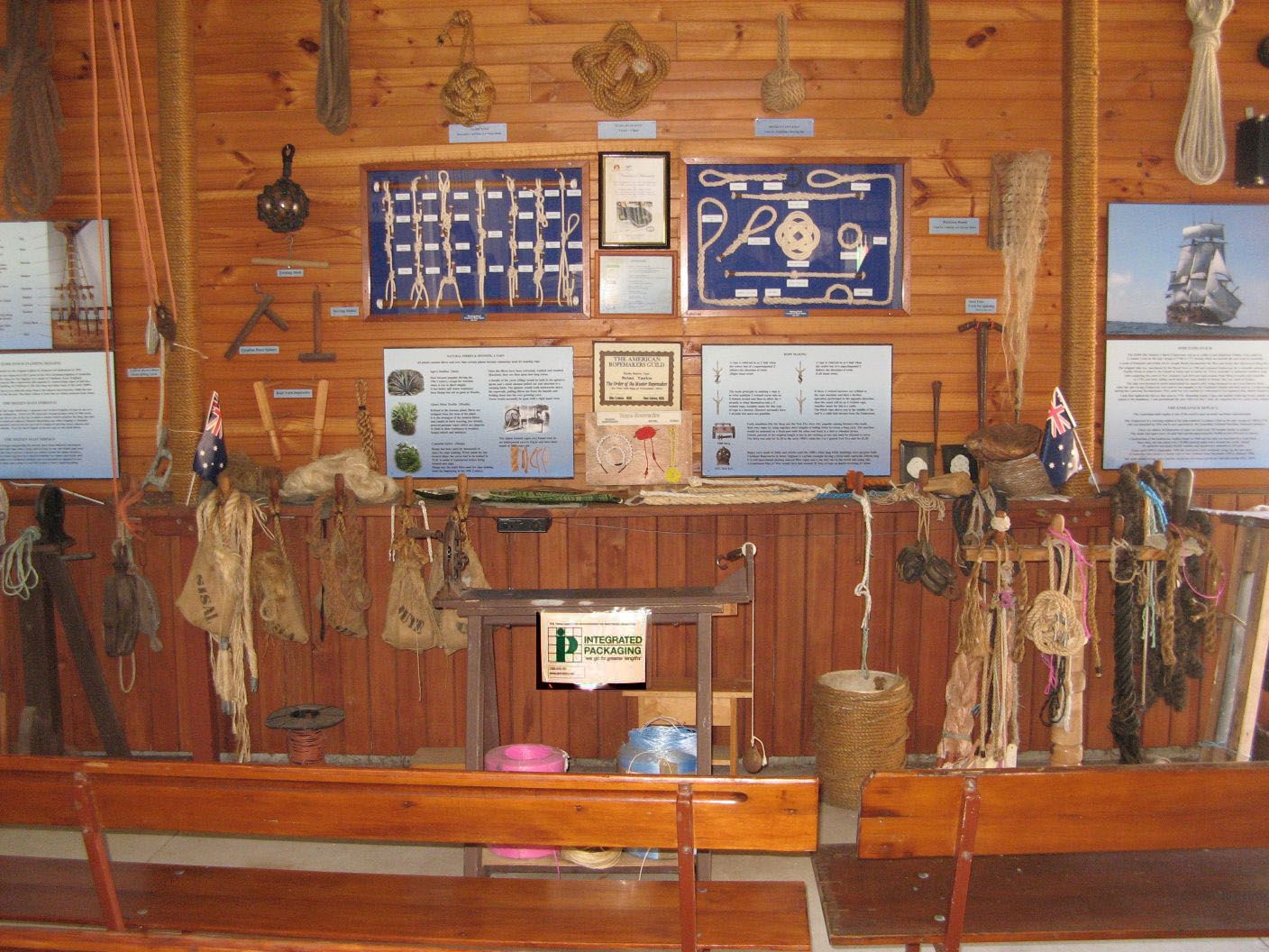 The rope making display is based on two things. One is the replica of the Endeavour, the ship used by Lt. Cook on his voyage along the East coast of Australia. It was during this voyage in 1770 that he saw and named “Hervey’s Bay” after a friend of his in the Admiralty in England, Sir Augustus Hervey. The ship was a converted collier from Whitby and was ideal for the journey. We have on display in the roof area two of the original standing rigging ropes from the replica which is based at the Maritime Museum in Sydney. We think we may be the only Museum to have these items on display.